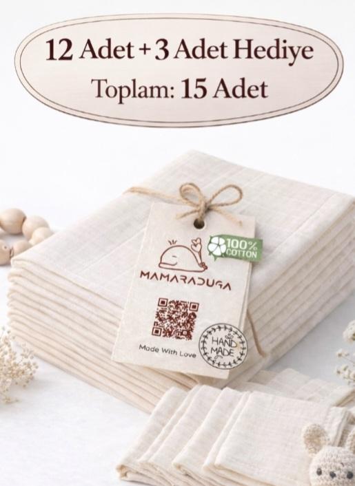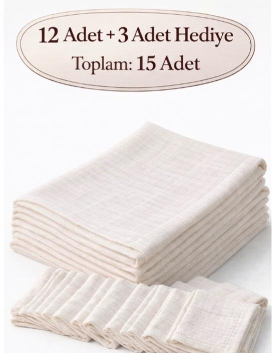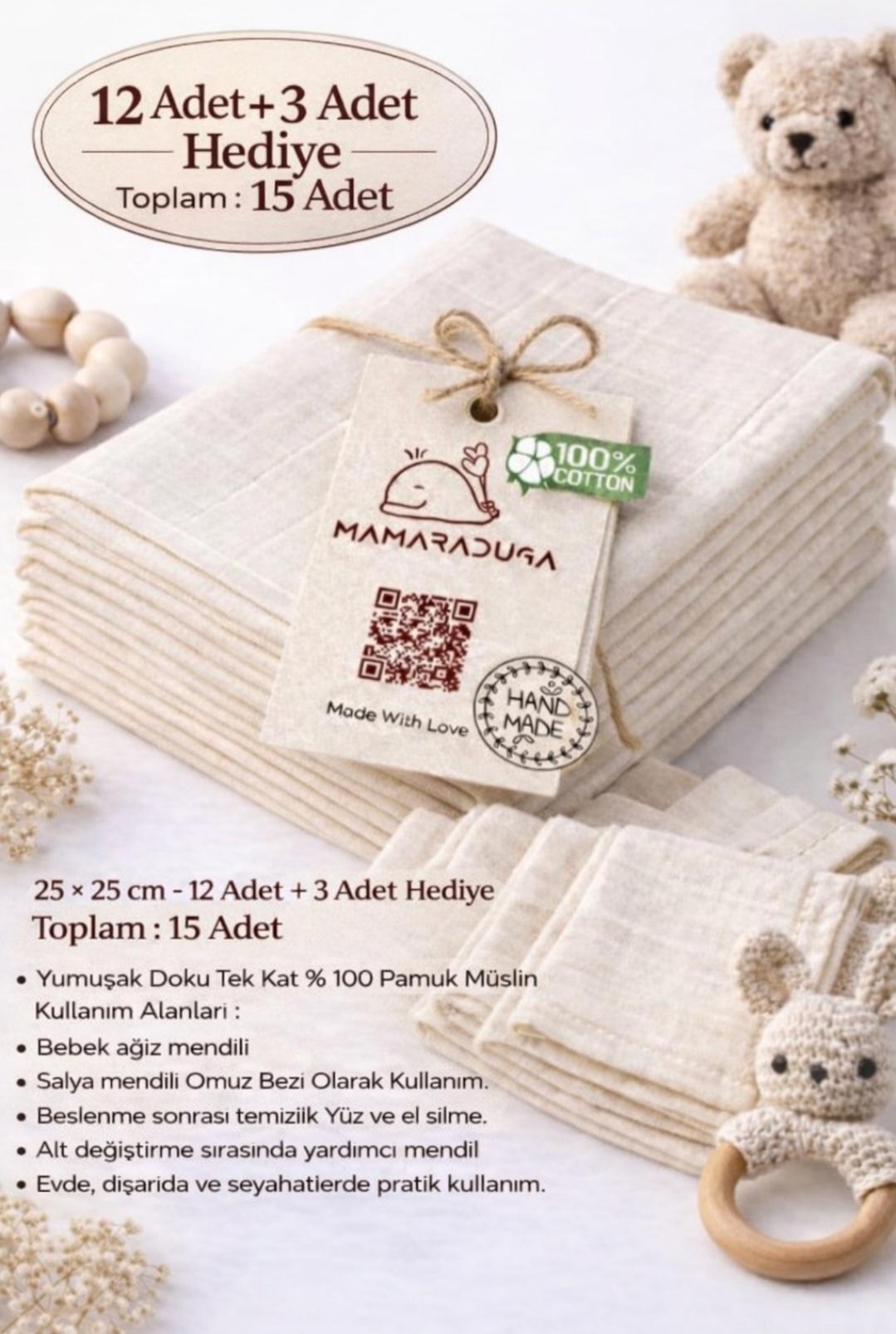 Tek Katlı Müslin Bebek Ağız Mendili – 25×25 cm | 12’li Set + 3 Adet Hediye Toplam : 15 Adet