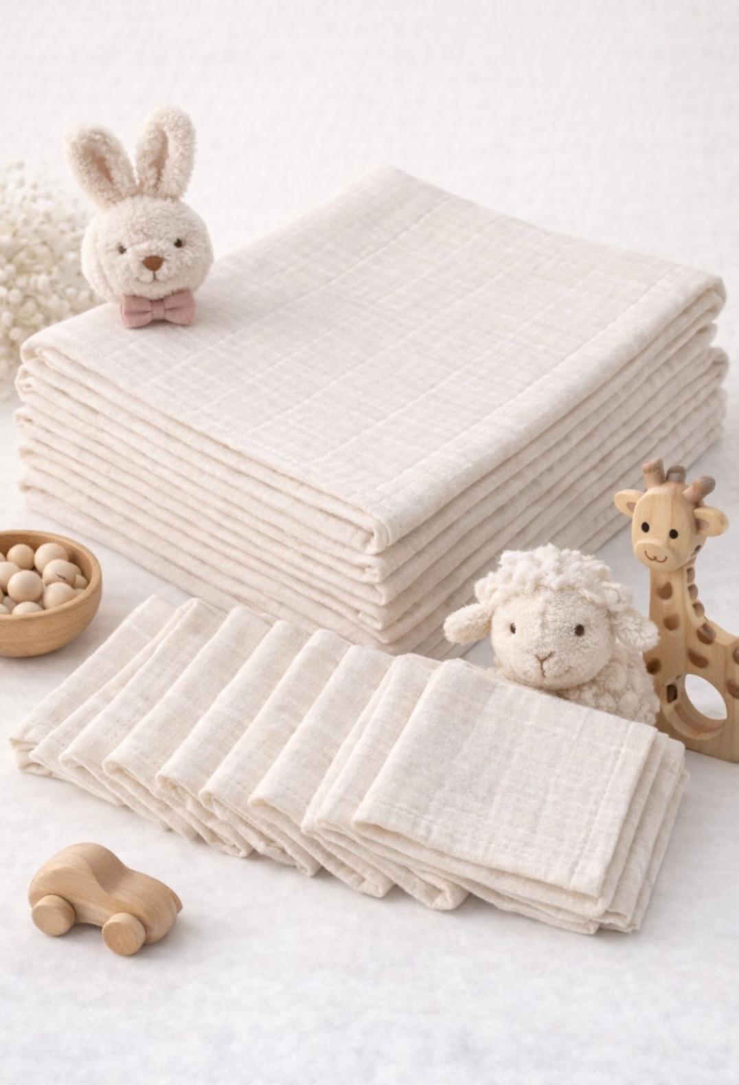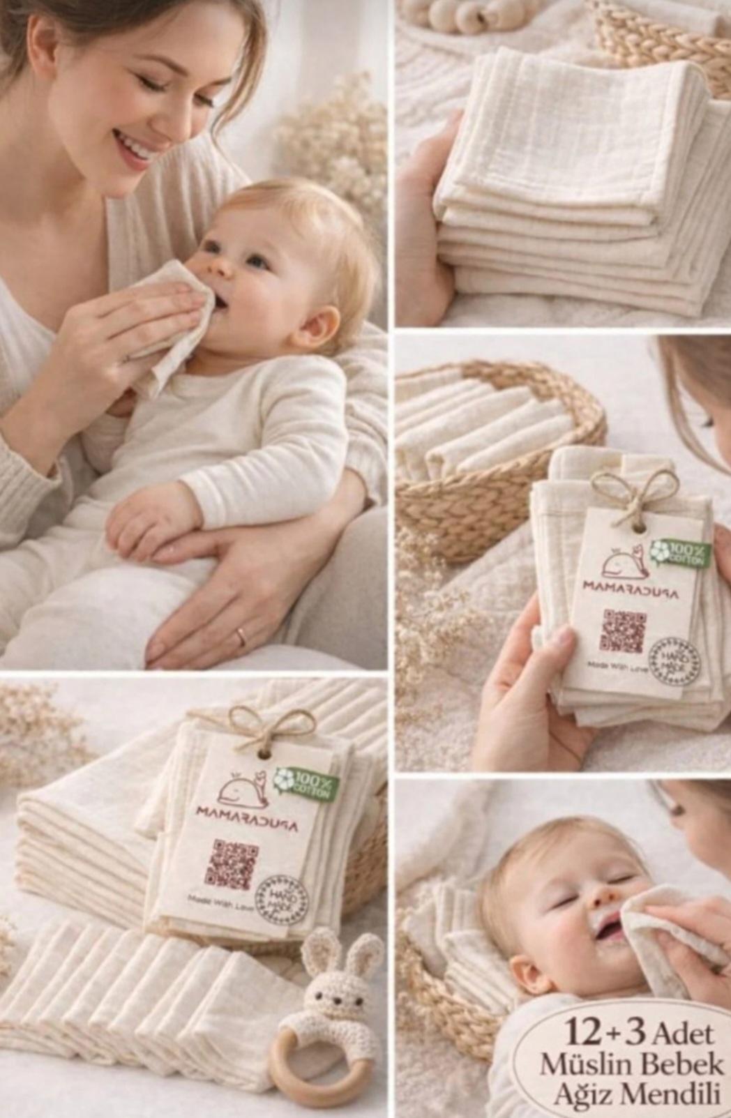 Bebeğinizin hassas cildi düşünülerek özenle üretilen %100 pamuk müslin bebek ağız mendilleri, yumuşak dokusu ve nefes alabilen yapısıyla günlük kullanım için idealdir. Doğal pamuk liflerinden üretilen müslin kumaş, bebeğinizin cildini tahriş etmeden nazik bir temizlik sağlar.