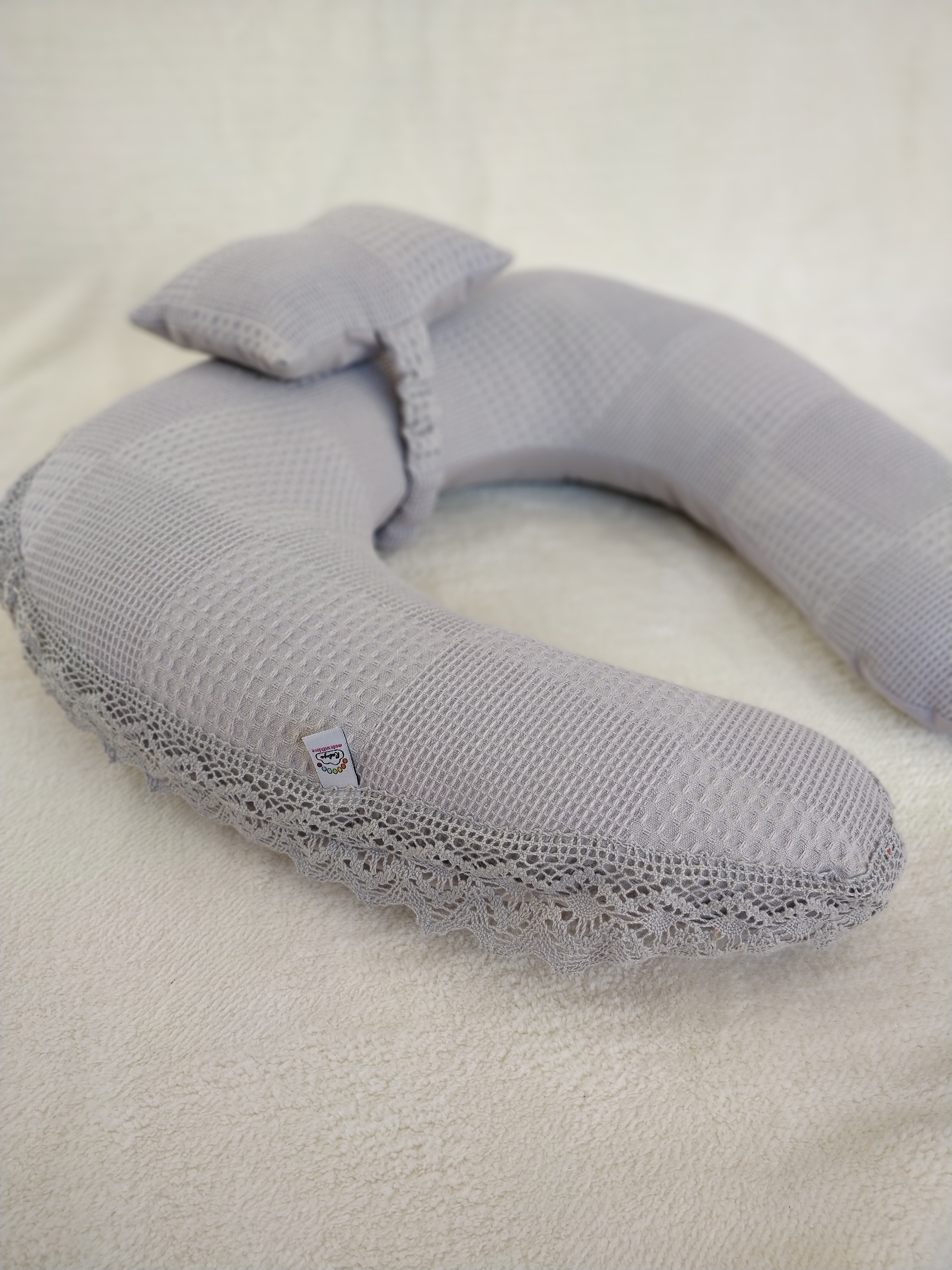 - 4-Emzirme Ve Destek Minderi Küçük Yastıklı. (Bir Tarafı % 100 Organik Pamuk Poplin Kumaş, Bir Tarafı % 100 Pamuk Waffle Pike Kumaş Dantelli Ve Fırfırlı.)