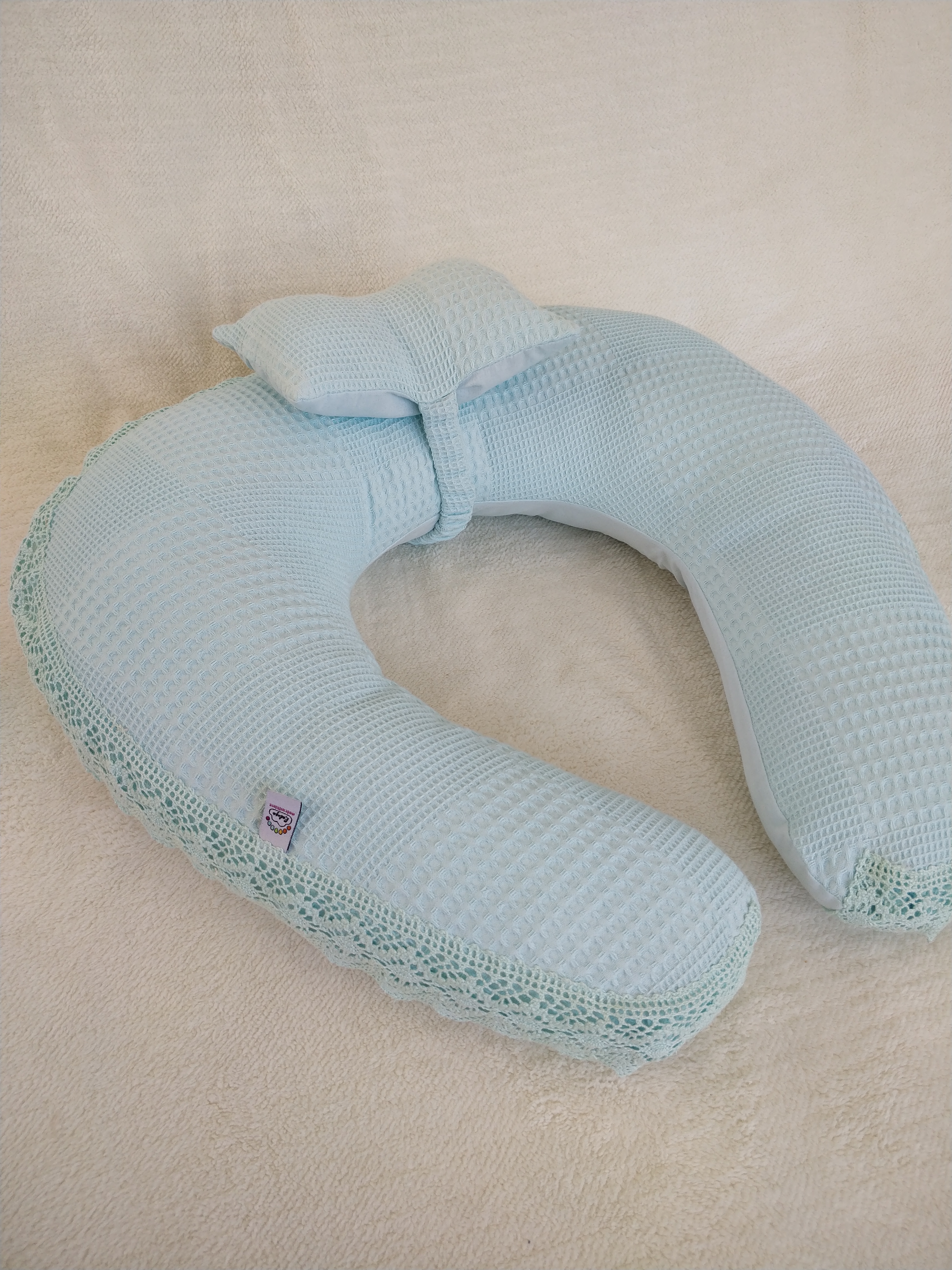 • 4-Emzirme Ve Destek Minderi Küçük Yastıklı. (Bir Tarafı % 100 Organik Pamuk Poplin Kumaş, Bir Tarafı % 100 Pamuk Waffle Pike Kumaş  Dantelli Ve Fırfırlı.)