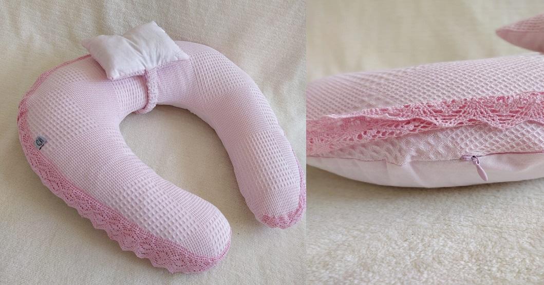 - 4-Emzirme Ve Destek Minderi Küçük Yastıklı. (Bir Tarafı % 100 Organik Pamuk Poplin Kumaş, Bir Tarafı % 100 Pamuk Waffle Pike Kumaş Dantelli Ve Fırfırlı.)