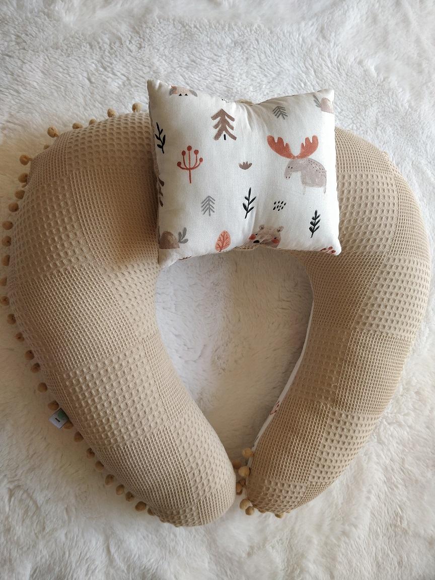 - 4-Emzirme Ve Destek Minderi Küçük Yastıklı. (Bir Tarafı % 100 Organik Pamuk Poplin Kumaş, Bir Tarafı % 100 Pamuk Waffle Pike Kumaş Ponponlu.)