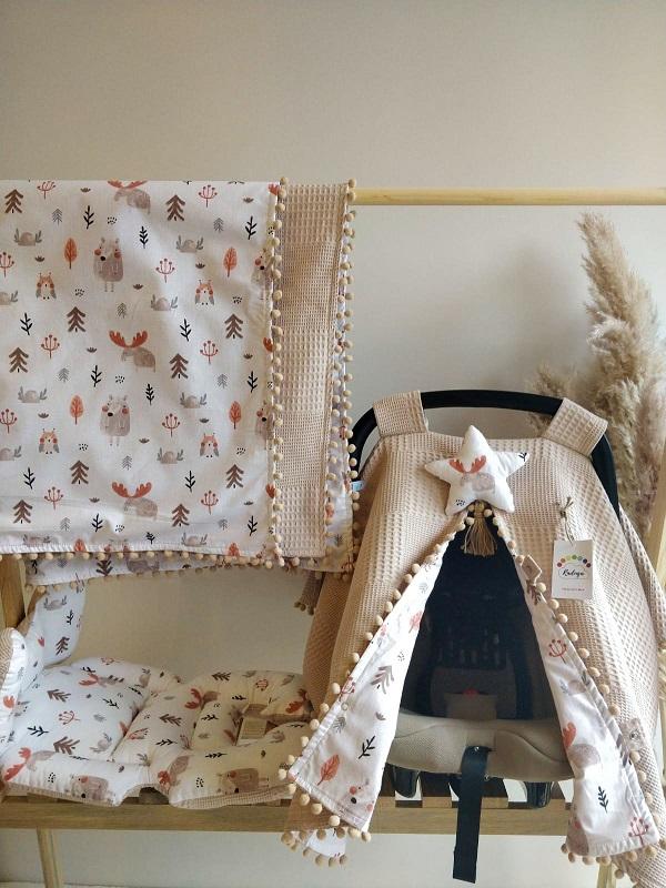 Babynest:Dıştan dışa : 110×85 cm İçten içe: 70×50 cm ölçülerindedir. Baş Yastığı 23×33 cm Ölçülerindedir. Bir Tarafı % 100 Organik Pamuk Poplin Kumaş, Bir Tarafı % 100 Pamuk Waffle Pike Kumaş Kullanılmıştır. Ponponlar Şık Bir Hava Katar. Nem ve Buharı emen 1. kalite sünger ve 1. kalite boncuk elyaf kullanılmıştır. Bebeği terletmez ve koku yapmaz. Fermuarlı iç astara sahip, çamaşır makinesinde yıkanabilir dikim yapılmıştır. 2 Yaşa kadar kullanılabilir. Çift Taraflı Ponponlu Battaniye ölçüsü :100×110 cm ölçülerindedir. Emzirme ve Destek Minderi : Bebeğinizi emzirmek veya beslemek için doğru pozisyonda olmasını sağlar. Hem bebeğiniz, hem de sizin için bu güzel dakikalardan keyif almanızı sağlar. Bebeğiniz 3 aylık olduğunda arasına bebeğinizi oturtup belini destekleyebilirsiniz. %100 pamuktan imal edilmiştir. Terleme yapmaz. Iç kılıf ve ana kumaş arası fermuarlı olup kolaylıkla yıkanabilir. İçinde 1. sınıf boncuk elyaf kullanılmıştır. Puset Örtüsü: 85×100 cm ölçülülerinde. Puset Çarşafı: 80×105 cm ölçülerindedir.