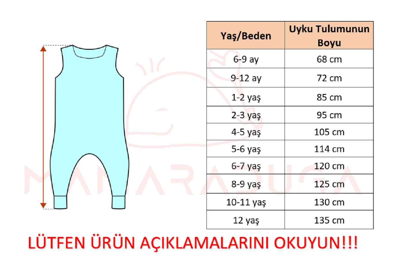 Rahat ve Bol Kalıp: Çift kat pazen tak-çıkar seyyar kollu uyku tulumlarımız geniş kalıplıdır. Örneğin; 3 yaşındaki bir çocuğa 2-3 yaş bedeni aldığınızda tulumu yaklaşık 1,5–2 yıl rahatlıkla kullanabilirsiniz. Bu nedenle gereksiz yere büyük beden almanıza gerek yoktur.