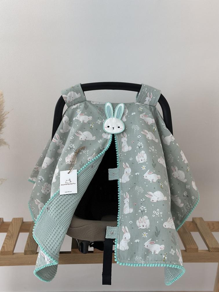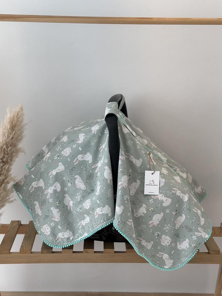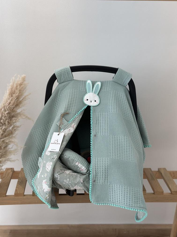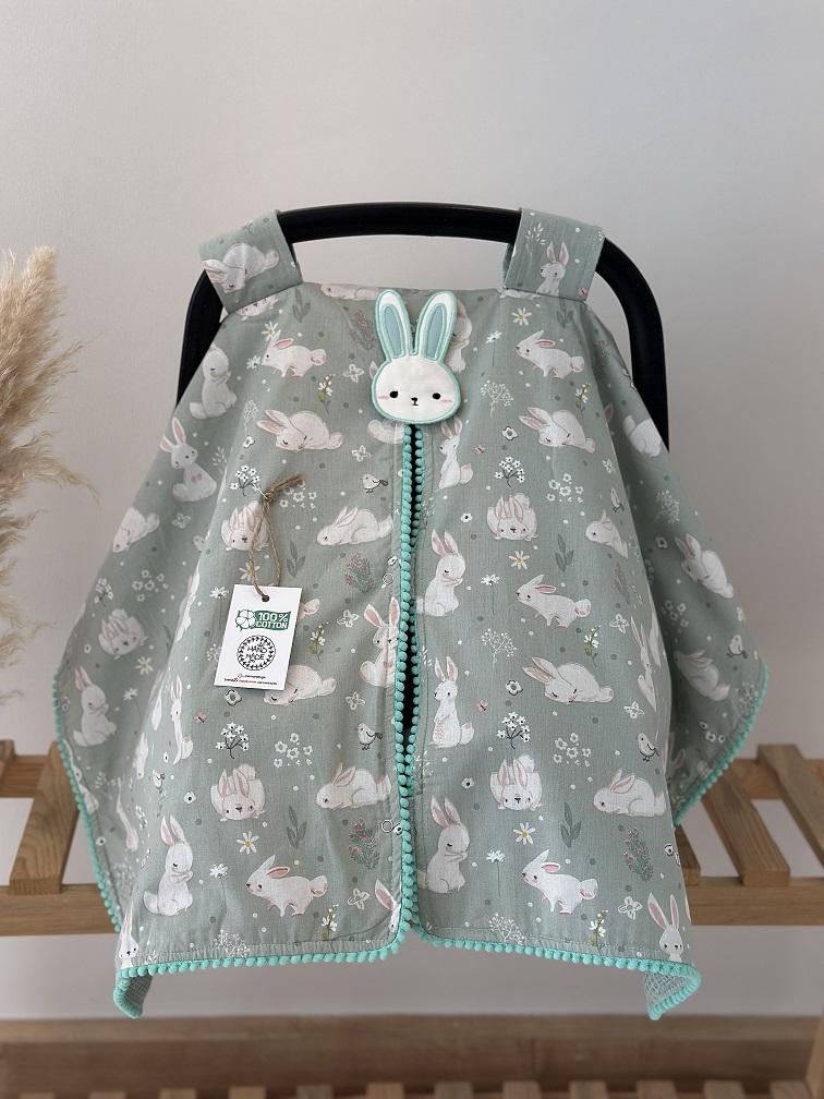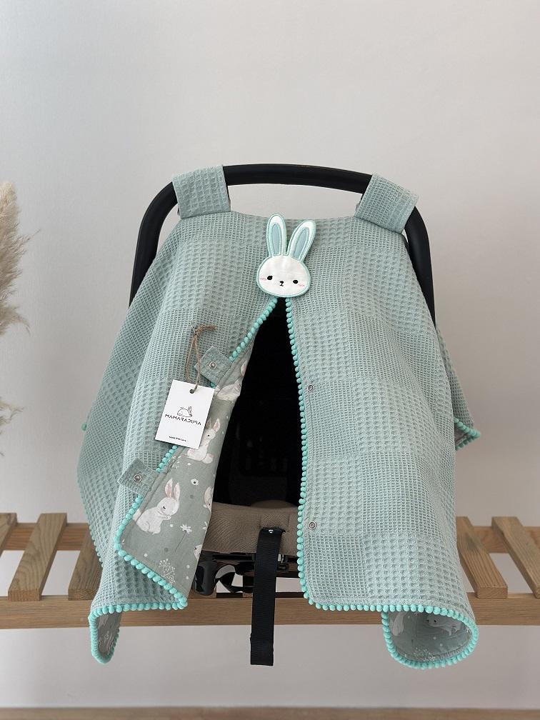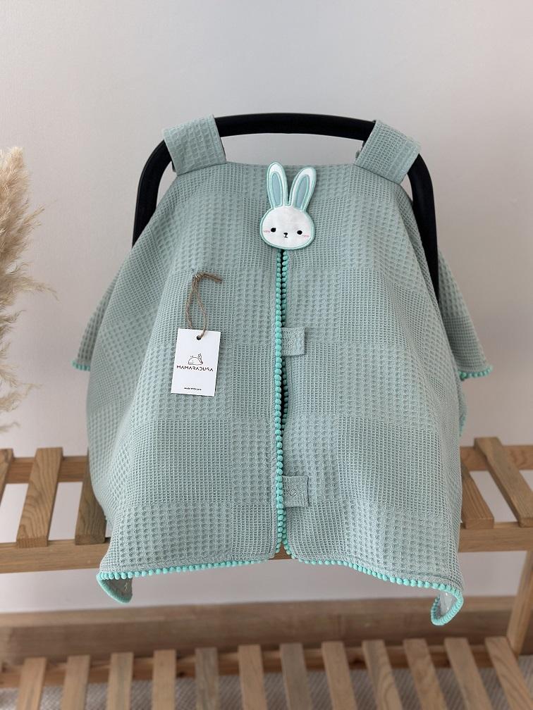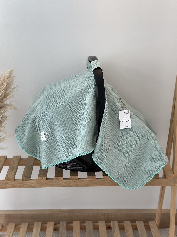- Çift Taraflı Puset Örtüsü (Bir Tarafı 100% Organik Pamuk Poplin Kumaş, Bir Tarafı 100% Pamuk Waffle Pike Kumaş. Minik Sıralı Ponpon ve Aplike Süslemeli).