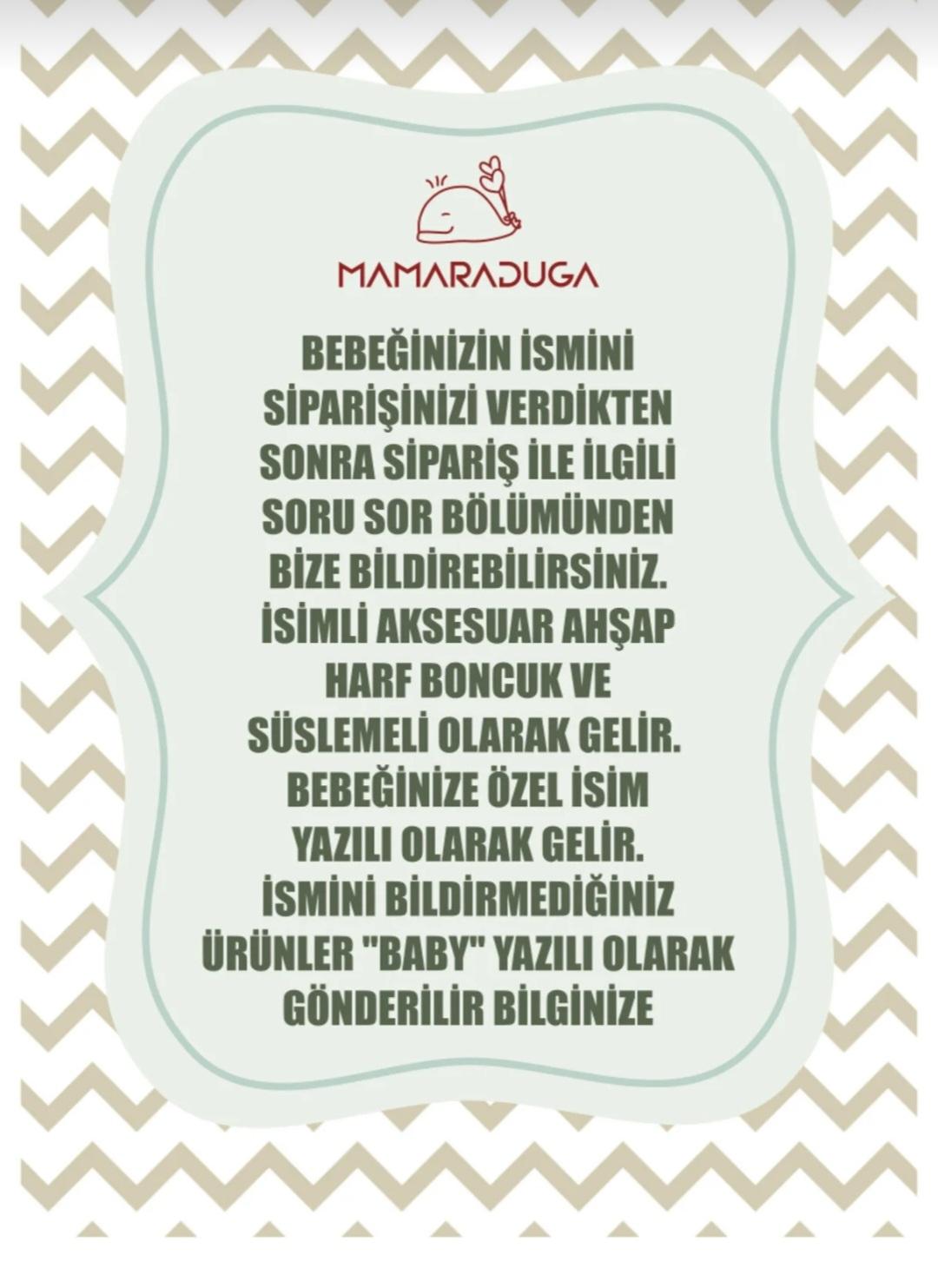NOT: BEBEĞİNİZİN İSMİNİ SİPARİŞİNİZİ VERDİKTEN SONRA SİPARİŞ İLE İLGİLİ WHATSAAP'TAN BİLGİ AL BÖLÜMÜNDEN BİLDİREBİLİRSİNİZ.İSİMLİ AKSESUAR AHŞAP HARF BONCUK VE SÜSLEMELİ OLARAK GELİR. , BEBEĞİNİZE ÖZEL İSİM YAZILI OLARAK GELİR. İSMİNİ BİLDİRMEDİĞİNİZ ÜRÜNLER RESİMDEKİ GİBİ NAME YAZILI OLARAK GÖNDERİLİR BİLGİNİZE.