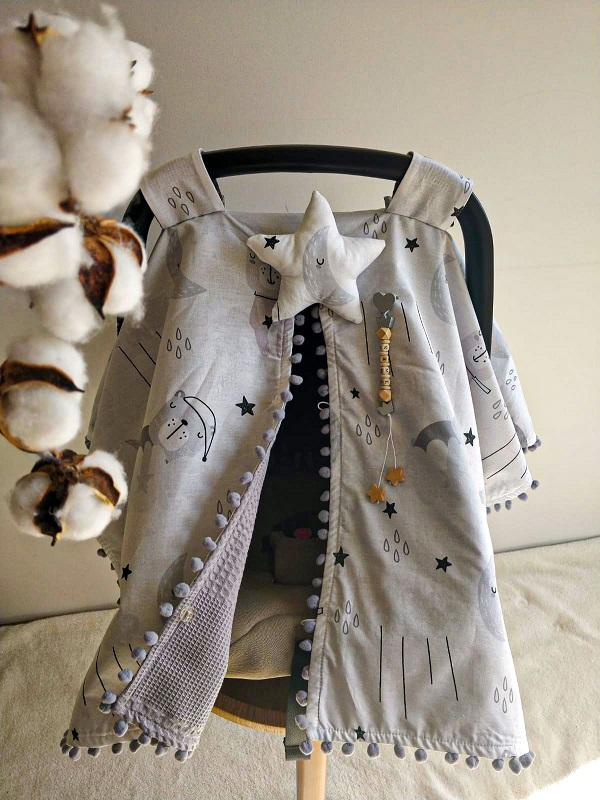 - Çift Taraflı Puset Örtüsü (Bir Tarafı 100% Organik Pamuk Poplin Kumaş, Bir Tarafı 100% Pamuk Waffle Pike Kumaş.Sıralı Ponpon Süslemeli).