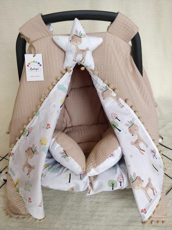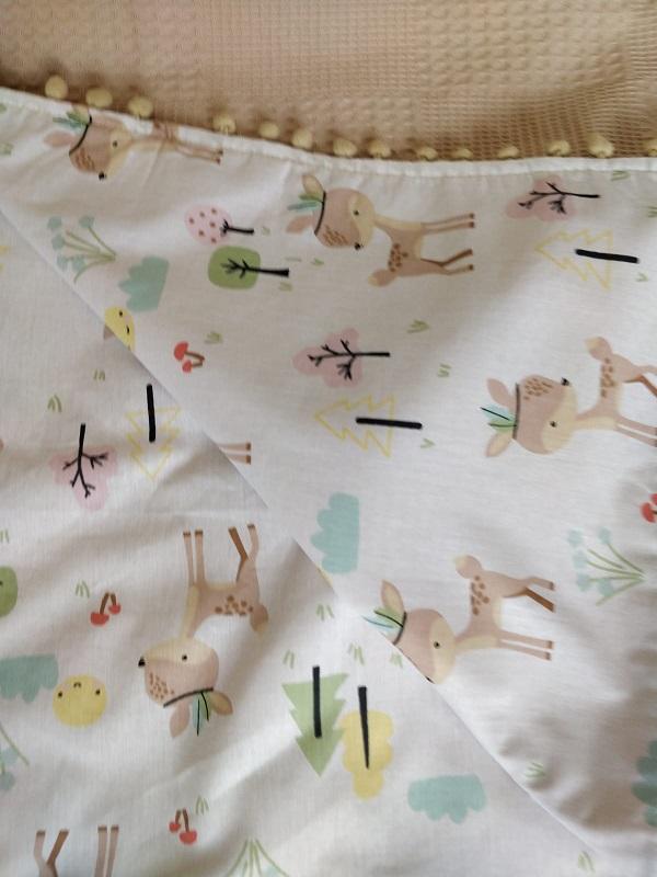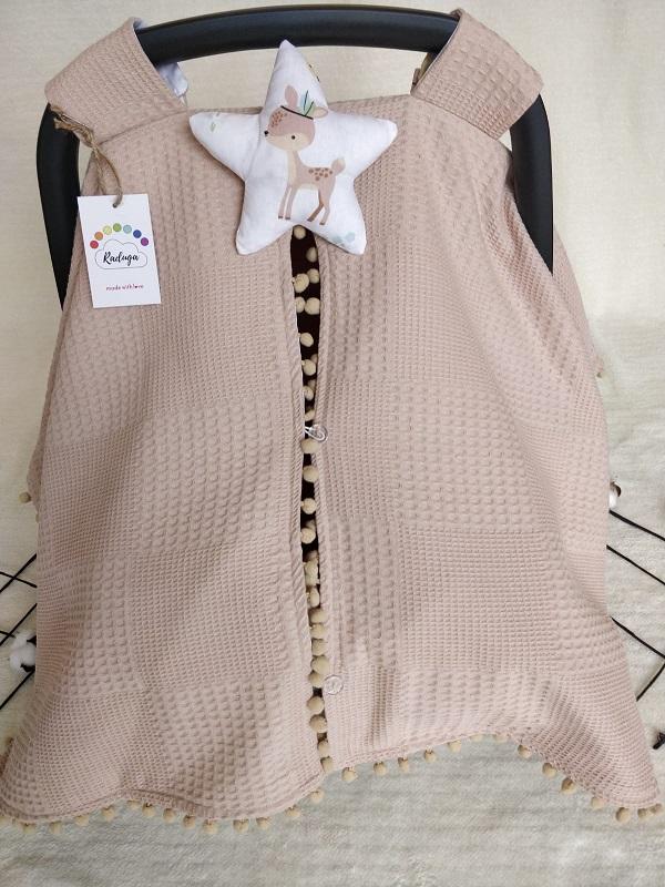 • Çift Taraflı Puset Örtüsü (Bir Tarafı 100% Organik Pamuk Poplin Kumaş, Bir Tarafı 100% Pamuk Waffle Pike Kumaş.Sıralı Ponpon Süslemeli).