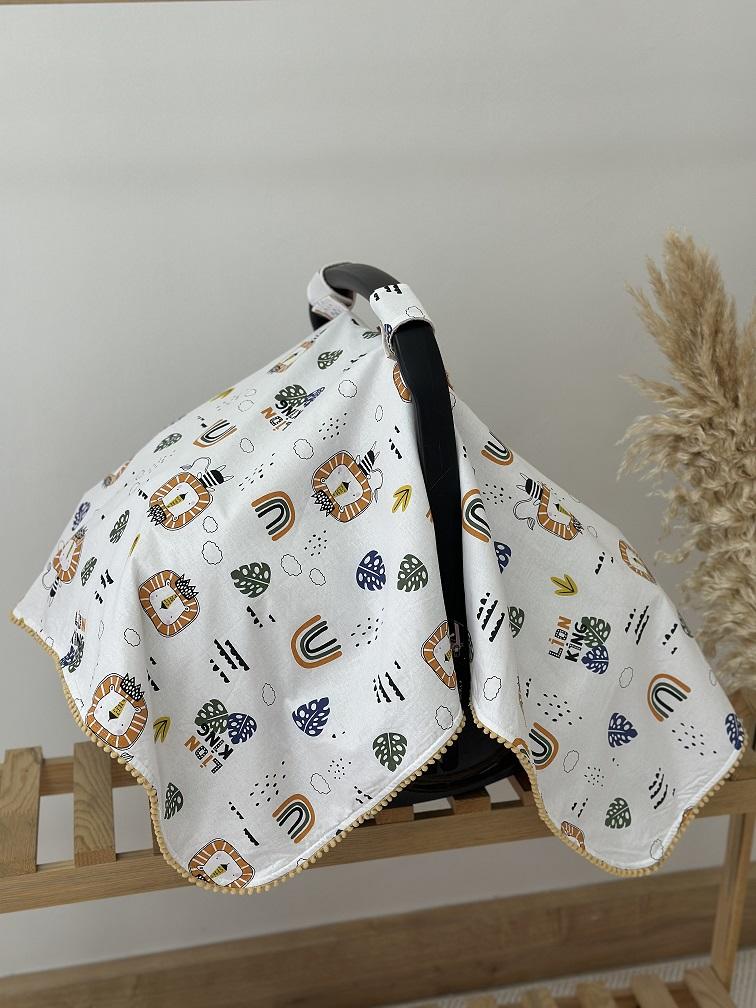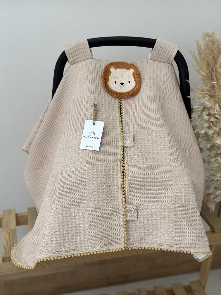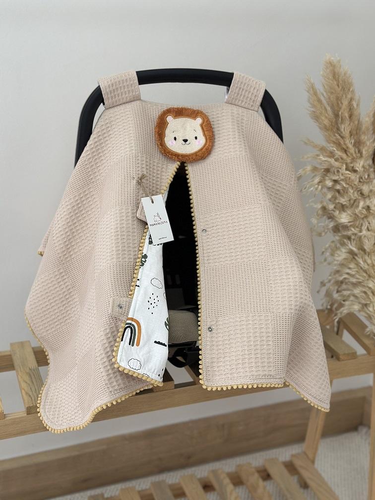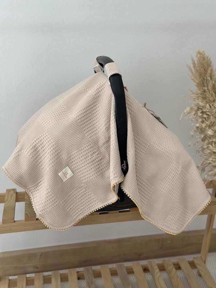 - Çift Taraflı Puset Örtüsü (Bir Tarafı % 100 Pamuk Waffle Pike Kumaş ve Minik Sıralı Ponpon Süslemeli.)
