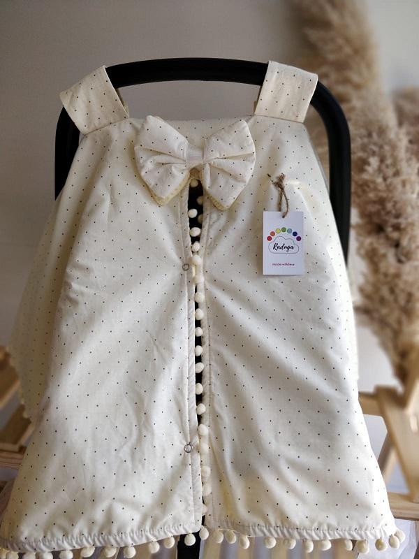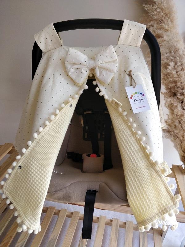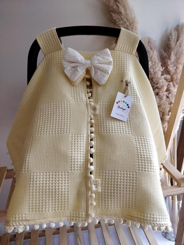 • Çift Taraflı Puset Örtüsü (Bir Tarafı % 100 Pamuk Waffle Pike Kumaş ve Sıralı Ponpon Süslemeli.)