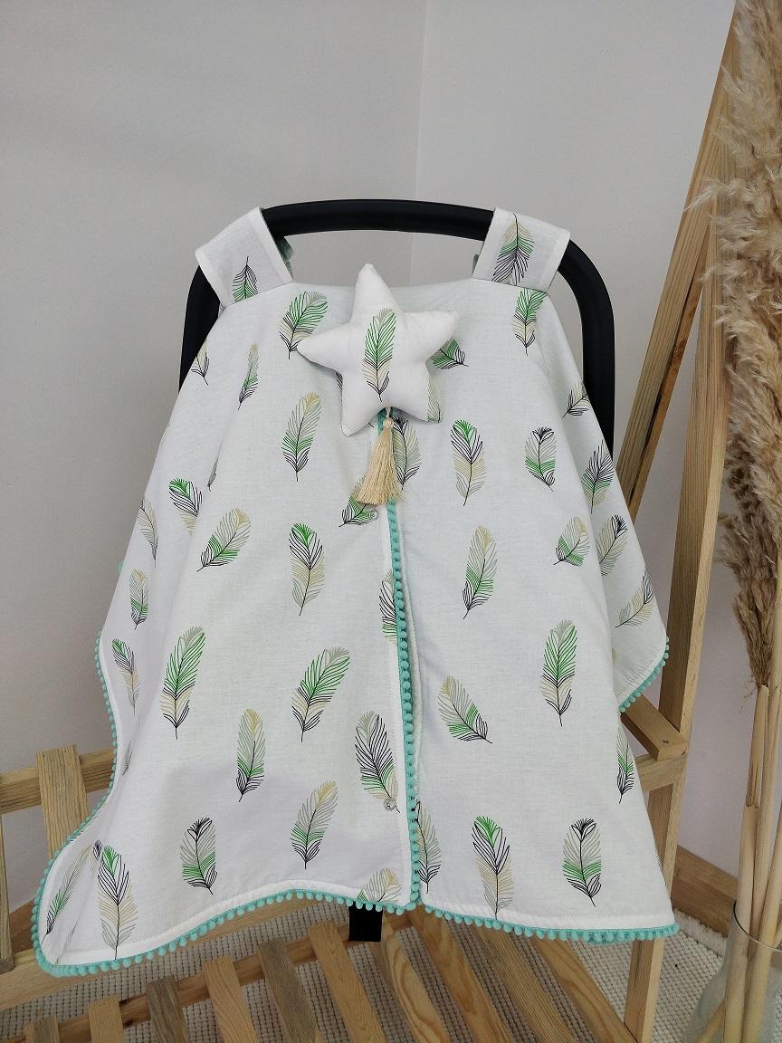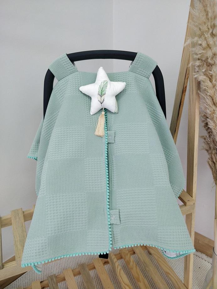 • Çift Taraflı Puset Örtüsü (Bir Tarafı % 100 Pamuk Waffle Pike Kumaş ve Minik Sıralı Ponpon Süslemeli.)